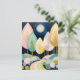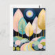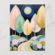 An ethereal and symbolic painting featuring a stylized, abstract forest scene. Tall, teardrop-shaped trees with spindly branches dominate the upper half of the canvas, their canopies in soft shades of pink, turquoise, and gold, with some featuring shimmering gold leaf details. A celestial body, a large orb with concentric rings of blue, purple, and yellow, hangs in the deep blue sky. The foreground is a rolling landscape of rounded hills in various pastels, with a winding, rainbow-colored path leading through them. The overall impression is one of a dreamlike, mystical landscape filled with vibrant colors and geometric forms.