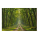 A dirt path winds through a dense forest, lined with tall trees on both sides. The trees are a vibrant green, with sunlight filtering through their leaves, creating a dappled effect on the ground. The path leads towards a hazy, sunlit opening in the distance, suggesting a clearing or a meadow. The atmosphere is serene and tranquil, inviting viewers to imagine a peaceful walk through nature.