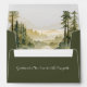 Dark green Christian wedding envelope depicts a casual nature watercolor design including a simple stream of water surrounded by forest pine trees and mountains in earth tone shades of sage, dark green and tan. It features a printed return address on the back flap and inspirational quote, "God has led Two lives to take One path." All text can be deleted or customized to the details of your choice.