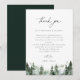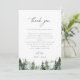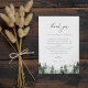 Elegant watercolor forest pine trees, Wedding reception thank you table card. Template provides multiple lines for your custom thank you message. Features, black typography on coordinating green and white backgrounds.
