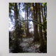 A snow covered branch creates an arch, with ferns hanging from its moss covered bark, across a tree lined path toward the summit of this hill in the woods of Rainier Oregon. Beyond the forest the sky shines crystal blue in the early morning light.