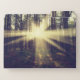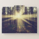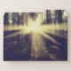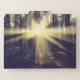 This photo features a pine tree forest bursting with sunbeams.