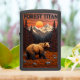 This lighter features an illustrative, dimensional design of a Grizzly Bear walking through a clearing of tall, rusty orange grass and rocks. The scene is framed by tall, dark pine trees. Snow-capped mountains are visible in the background under a vibrant orange sunset with a large sun disk. The phrase "FOREST TITAN" is set in dimensional block letters at the top. The design is set on a matte black lighter casing. The design may look real due to the high detail in the artwork.