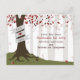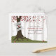 A wedding save the date postcard featuring an illustration of a tree in the forest. Tree has leaves that are various shades of red, exposed roots, and a trunk wrapped with banner that can be customized with bride & groom's names.