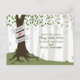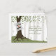 A wedding save the date postcard featuring an illustration of a tree in the forest. Tree has green leaves, exposed roots, and a trunk wrapped with banner that can be customized with bride & groom's names.