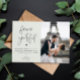 personalised wedding thank you card with elegant black stylish script and a custom photo of the bride and groom.
