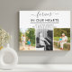 Custom wrapped canvas with remembrance photos and personalized memorial message. The title reads "forever in our hearts" in elegant handwritten script and modern uppercase print. The photo template is set up ready for you to add 3 of your cherished photos and you can also add your own custom wording. The sample memorial note reads "In loving memory of a kind and gentle man" and you can edit this however you wish. The design has a color palette of black typography on a white background which you can edit by clicking customize further (or you can just message me for assistance).