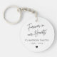 Double sided keychain featuring the text "Forever in our hearts" in an elegant, handwritten style font; customizable name and year, and a custom color heart. On the back is a photo template.