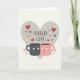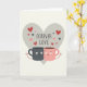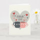 This card shows two cute anthropomorphic mugs standing close together along the lower third, one in dark charcoal grey and the other in soft pink, with wide eyes, tiny blush marks, and a shy, affectionate lean toward each other 🥰. Behind them sits a large pale grey heart like a soft halo, giving the scene a calm center. Across that big heart, the words “FOREVER LOVE” are set in uppercase, clean sans‑serif lettering in dark grey, placed right in the middle. Around the text, small hearts in red, pink, and grey float like confetti, adding little sparks of romance ❤️. Thin red lines curl out from behind each mug and meet between them, forming a gentle clasp that reads like linked hands. The background stays warm off‑white, letting the muted pink, charcoal, and red accents stand out without feeling loud. The mugs’ rounded shapes, rosy cheeks, and slightly nervous smiles make the closeness feel tender and real. A cluster of tiny hearts drifts upward around the central grey heart, with a few scattered near the top corners.