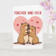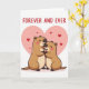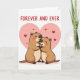 This greeting card shows two cute, cartoon groundhog-like animals hugging close in the center. They are warm brown with simple outlines, and both have their eyes closed with rosy cheeks, looking calm and happy. The bigger one wraps its arms around the smaller one, making the moment feel sweet and safe. Behind them is a large soft pink heart, and a few small red hearts float around it to add extra love ❤️. At the top of the card, the words “FOREVER AND EVER” appear in red, hand-drawn block-style letters that stand out clearly. The background is plain white, which helps the browns, pinks, and reds feel warm and easy to notice 💌🍫.