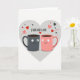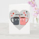 This design shows two cute anthropomorphic mugs standing close together, one in dark grey and the other in blush pink, leaning in like close friends or sweethearts 🥰. Their wide white eyes and small, upturned smiles face forward, giving the scene a gentle, happy energy that reads as affectionate without trying too hard. A large muted-grey heart outline sits behind them like a soft frame, wrapping the pair in a quiet, cozy embrace ❤️. Near the top, the words “FOREVER LOVE” are placed above the mugs in dark grey, easy-to-read letters that balance the illustration. Around the couple and the headline, small hearts drift and scatter in red, light pink, and dark grey, adding motion and a light romantic sparkle. The background stays simple with soft pastel tones and subtle shading, keeping attention on the mugs and the heart shapes. The overall layout centers the mugs inside the big heart, with the smaller hearts sprinkled mostly around the upper half and sides. The dark grey mug sits on the left and the pink mug on the right, with tiny hearts floating around them and the headline at the top.