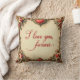 This image presents a charming and antique-style Valentine's Day card design. It features a central message, "I love you, forever," written in an elegant, flowing script against a parchment-like background with slightly faded, warm tones. The message is framed by an ornate border composed of intertwining leafy vines, small red hearts, and four cherubic figures or cupids nestled within the foliage at each corner. The edges of the card have a subtly distressed or torn look, enhancing its vintage appeal