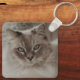 Square photo pet memorial key chain personalized with two photos of your cat, one on either side, and their name and years living with Forever Missed in a retro script and two cute cat paw prints.