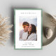Chic minimalist engagement announcement cards feature a vertical or portrait oriented photo on a white background with a thin watercolor stripe border in ethereal shades of jade green. "Forever Starts Here" appears at the top in modern lettering, with your announcement, names, and additional details at the bottom.