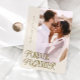 Vintage and elegant wedding announcement card featuring a typography text mixed with script and serif fonts that says "Forever Together" with a photo in an arched frame. The background is cream.