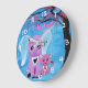 Adorable pink elephant and pink kitty cat sit under a cherry blossom tree. Their hearts are exposed on their chests and also have little hearts on one of each of their ears. The elephant has a ribbon around her trunk to remind her not to forget the special friendship she has with her kitten. Lovely bright blue background really makes the pinks pop.