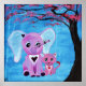 Adorable pink elephant and pink kitty cat sit under a cherry blossom tree. Their hearts are exposed on their chests and also have little hearts on one of each of their ears. The elephant has a ribbon around her trunk to remind her not to forget the special friendship she has with her kitten. Lovely bright blue background really makes the pinks pop.