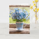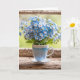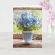 Pretty blue forget-me-not flower bunch in coffee cup by rustic farmhouse window.