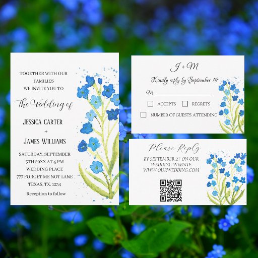 Plain white envelopes are included with paper invitations and will come to fit the invitation size you select. If you don’t need the envelopes, you may choose to not receive them by selecting the dropdown below "Envelopes" and choosing "None." If you’d like to have a design on your envelopes, you can browse all of these available envelopes to find the design that complements your Forget Me Not Watercolor Floral Wedding Invitation.