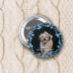 Pet memorial button personalized with a photo of your pet inside a wreath of forget me nots. Floral pet memorial button with forget me nots, a photo of your pet, and their name. Pretty forget me not pet memorial button personalized with name and photo.