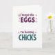 This design shows a digitally rendered graphic on a bright white background with a tall, vertical layout that leans into flirty humor and friendly teasing 🐰. Near the top, the phrase “Forget the” appears in a slender, slightly slanted style, followed by “EGGS” in larger, heavier letters, all set in a deep plum tone. Below that, a small star symbol introduces “I’m hunting,” leading into “CHICKS” in the biggest type on the line, colored a deep teal for strong contrast. The spacing between the two lines keeps the message easy to read while giving each phrase its own moment on the page. Soft pink line art of long bunny ears 🐇 frames the theme without crowding the words, and tiny pink hearts and little burst marks add a sweet, cheeky undertone like a shared inside joke. A small lip icon tucked among the accents adds a gentle hint of romance, as if the design is winking at someone special. The final details show pale pink hearts and starbursts scattered around the plum and teal lettering, with the bunny-ear outlines sitting lightly above the text.