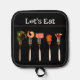 Dress up the look of your kitchen with this modern designed black Lets Eat pot holder. The design on this holder features succulent foods on silver forks. This modern black pot holder would be a thoughtful housewarming or another occasion gift for anyone.