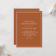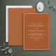 Plain white envelopes are included with paper invitations and will come to fit the invitation size you select. If you don’t need the envelopes, you may choose to not receive them by selecting the dropdown below "Envelopes" and choosing "None." If you’d like to have a design on your envelopes, you can browse all of these available envelopes to find the design that complements your Formal Burnt Orange Classic Script Wedding Invitation.