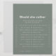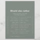 This formal green would she rather bridal shower game is perfect for a classic bridal shower celebration. The design features a beautiful font in a green background to embellish your event.