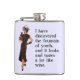 6 oz. lavender vinyl-wrapped flask with a vintage 1940s image of a smartly dressed woman holding a wine glass. The text reads, “I have discovered the fountain of youth, and it looks and tastes a lot like wine.” See matching shot glass and coasters. See the entire Patriotic 40s Flask collection in the FOOD/BEV | Dishes section. Note: The front, unopened display option was photographed by Zazzle with a slight tilt, such that the image appears off center. The front, opened display option, however, was photographed correctly. Here the image is centered. The image is also centered in the “in situ” display option.