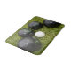 Pictured on green grass are four black lawn bowls and jack