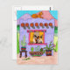 These four curious cats are sitting in the pink-and-talavera framed window and on the roof of a pleasingly purple Taos-style adobe dwelling in the American southwest. Richly textured cacti and succulent plants in colorful talavera pots accent the house, providing a welcome contrast to the desert sand, where a lizard sits nearby. Pink and lavender mountains, as well as greenery, brighten the background beneath a cloudless bright blue sky.