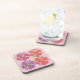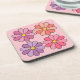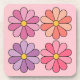 This coaster features four stylized daisies on a light pink background. Each flower has 10 petals arranged in a circular pattern with outlines. The flowers look cute and cheery on the pink background. The coaster is a hard plastic coaster with a cork back. The set contains six coasters.