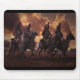 Four Napoleonic-era French Cuirassiers canter across a field with sabers drawn.