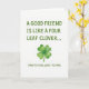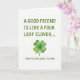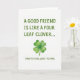 This card features a white background with a centered quote in medium green lettering that feels like friendly handwriting, reading, “A GOOD FRIEND IS LIKE A FOUR LEAF CLOVER... HARD TO FIND, LUCKY TO HAVE.” The lines are stacked and vertically centered, with the ellipsis creating a small pause that draws your eye downward. Just beneath the dots sits a four-leaf clover in soft watercolor greens, shifting from light lime edges to deeper emerald shadows. The gentle blending gives the leaves a tender, brushed texture, like a quiet gift passed between close friends 💚. With so much open white space around the words and clover, the design keeps the focus on that close, lucky bond without any extra distractions. The text stays in the upper and middle area, while the clover anchors the lower center, adding a calm St. Patrick’s Day touch ☘️. The clover’s rounded leaves show subtle shading and a slightly darker stem, centered neatly under the quote.