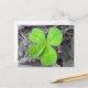 A postcard featuring a photo of a four leaf clover. Clover is green, background is black and white.