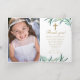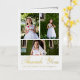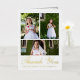 This elegant Catholic First Holy Communion thank you card features a three photo collage with real gold foil typography on the front, and a sweet thank you editable message inside with a simple gold color cross, rustic watercolor greenery leaves, and one full photo. Only the front of this thank you card is real foil. This First Holy Eucharist thank you card is editable for a variety of Christian religious occasions, or to update to your own personal thank you message.