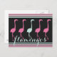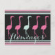 Four Pink Flamingos One Light Blue. Pink and light blue stripes above and below. "Flamingos" in matching blue