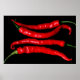 Four Red Chilies - Four horizontal red cayenne chili peppers photographed on a simple black background.