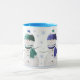A customizable mug featuring four snowman with blue/aqua coloured bobble hats and scarves. The background is white with pale blue snowlakes. You can customize this mug by adding your own text.
