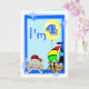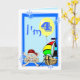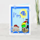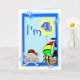 4th birthday card with funny pirate and ship, clown, penguin and balloons, on a blue background. Easily personalize this design by adding or changing the text.