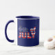 Coffee mug. Text 4th of July as the American Flag on one side, The text JULY4 in the form of the USA flag and fireworks on the other. Fourth of July Independence Day patriotic souvenir or gift. Customizable. You can change two images and you can change or delete the template text America. Do not forget to choose another style of the mug as well as the color of the background.