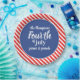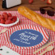 This design features a simple blue-white star pattern, a fourth 4th of July holiday, with calligraphy script custom personalization a summer picnic BBQ outdoor cookout, a simple minimalist minimal design, a basic simple star pattern, a Fourth of July party supplies, a summer party paper plate, outdoor backyard barbeque party, an independence America American flag, a patriotic stars American flag
