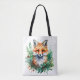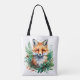A little red fox peers out from holly branches accented with bright, red berries in this charming watercolor on a holiday tote bag. Perfect for anyone who loves foxes, nature, and wildlife.
