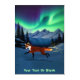 A red fox (Vulpes vulpes) running through a snowy, winter night with the Northern Lights aglow over distant mountains; sparks emanate from the fox's tail. Customize by adding your own text.