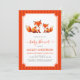 The text is in a red frame on a red stripes background. In the upper part of the frame, above all text, there are 2 cute red foxes, the bigger mama fox and the smaller baby fox pup, painted in watercolor. Under it there is the text: the words "baby shower" and are written in a red handwriting script, the name and the date / time in red caps, the rest in smaller black caps. On the back, there are only red stripes. The red stripes pattern alternates two nuances of red, a darker and lighter, more vivid one.
