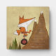 A cute fox with a smile on his face pedals up a tall mountainside on a unicycle. Pine trees are seen in the background as birds fly in the air. The mountainside has words of encouragement and a reminder that you are more than a conqueror. Original design by Christie Black of Creations from the Heart.