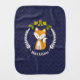 A burp cloth for baby boy featuring a woodland themed wreath with illustrations of a fox, leaves, acorn, and flowers. Background is dark blue with chevron pattern.