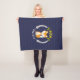 A fleece blanket featuring an illustration of a fox inside a wreath. Background is blue with chevron pattern. Personalize the name.