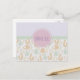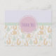 A postcard with a pattern illustrated with adorable foxes, birds and whimsical trees. The top half has a lavender purple background with a linen style texture. The center has a pastel green banner. A pink circle holds the words "Thank You'. I think this whimsical pattern is really cute and reminds me of the happy times spent in nature.