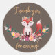 Watercolour fox sitting on a floral border with flowers on the head round thank you sticker. Brown background with dark gold letters and decorative handwritten font.